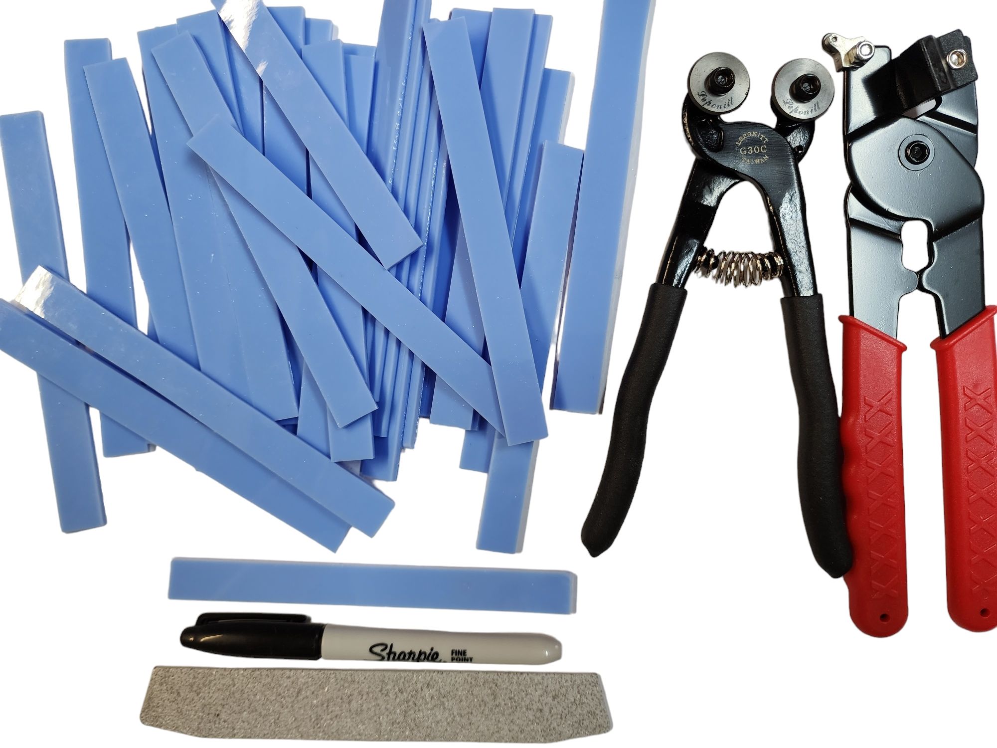 Hand cut stained glass strips.