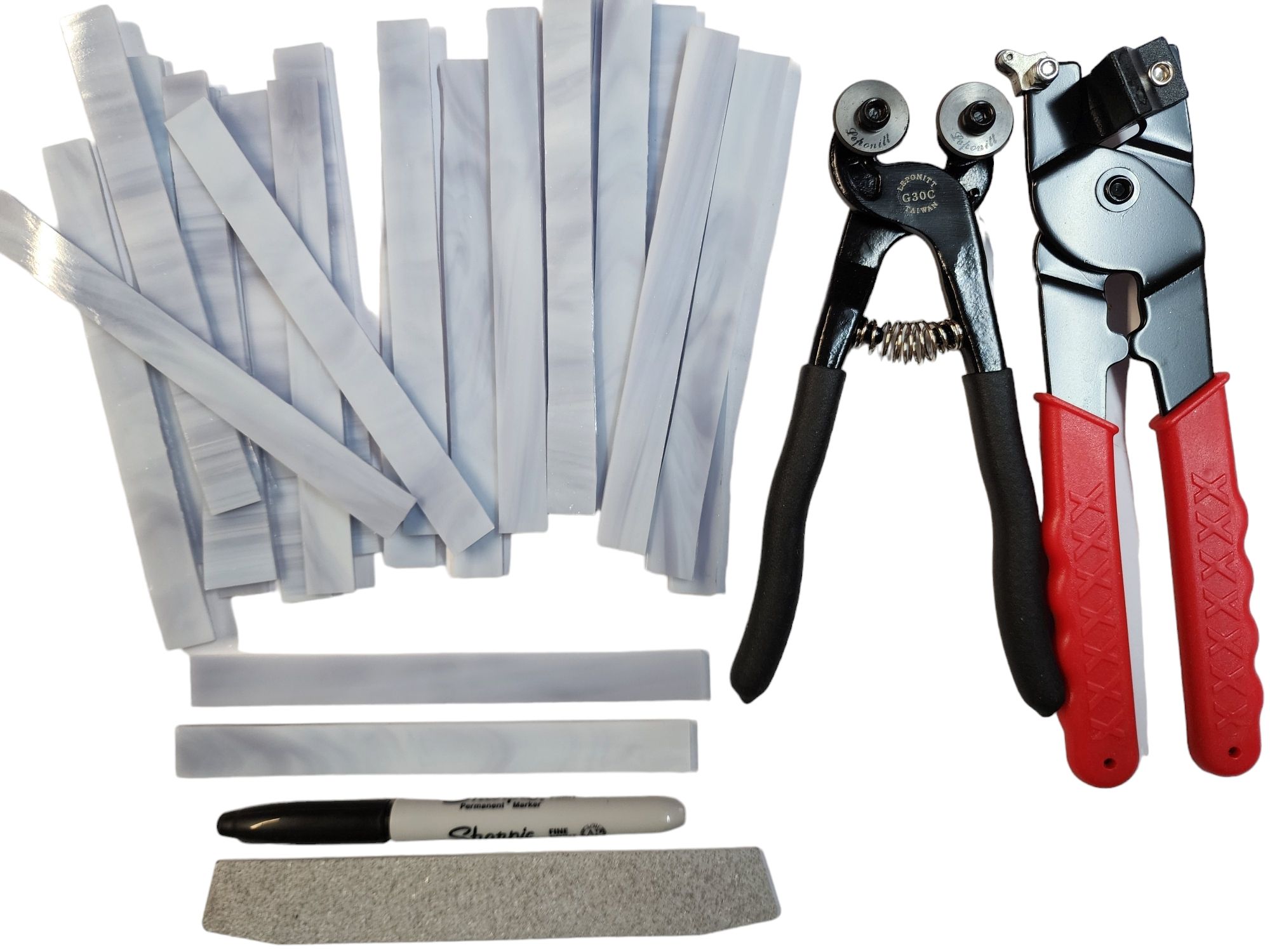 Hand cut stained glass strips.