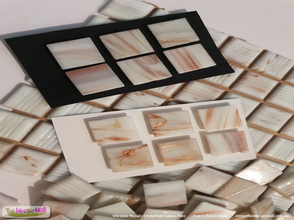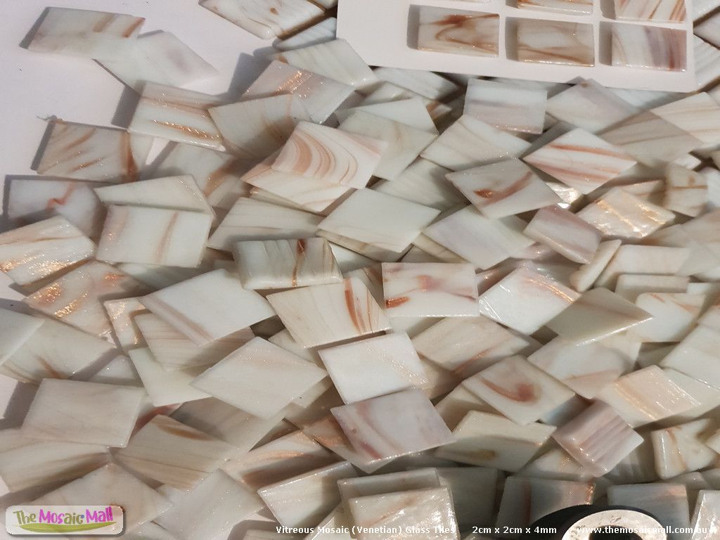 Golden, white, Beautiful Vitreous Glass Mosaic Tiles (Venetian Tiles). Buy glass mosaic tiles online at The Mosaic Mall, OzMosaics online mosaic shop. Australia's largest range of mosaic glass tiles for mosaic art and craft. 2cm x 2cm x 4mm. Shape and nip with Leponitt Mosaic Wheeled Nippers to create triangles, rectangles, circles, petal shapes, irregular shapes etc. Indoors and outdoors.