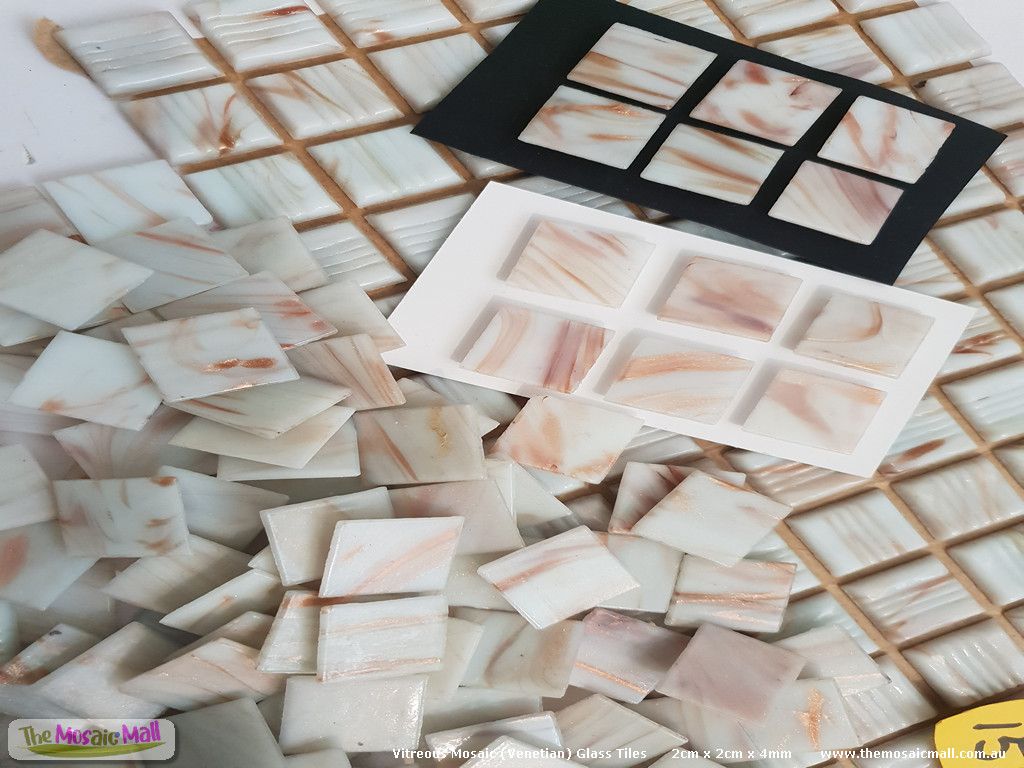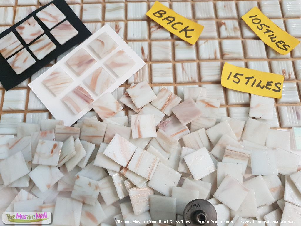 Marble, white, beautiful Vitreous Glass Mosaic Tiles (Venetian Tiles). Buy glass mosaic tiles online at The Mosaic Mall, OzMosaics online mosaic shop. Australia's largest range of mosaic glass tiles for mosaic art and craft. 2cm x 2cm x 4mm. Shape and nip with Leponitt Mosaic Wheeled Nippers to create triangles, rectangles, circles, petal shapes, irregular shapes etc. Indoors and outdoors.